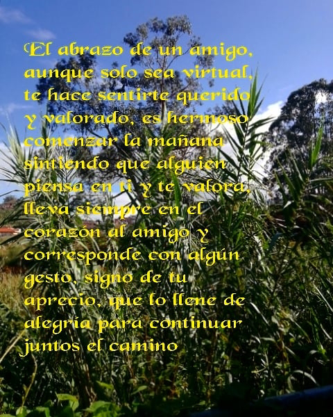 El abrazo de un amigo, aunque solo sea virtual, te hace sentirte querido y valorado, es hermoso comenzar la mañana sintiendo que alguien piensa en ti y te valora, lleva siempre en el corazón al amigo y corresponde con algún gesto, signo de tu aprecio, que lo llene de alegría para continuar juntos el camino