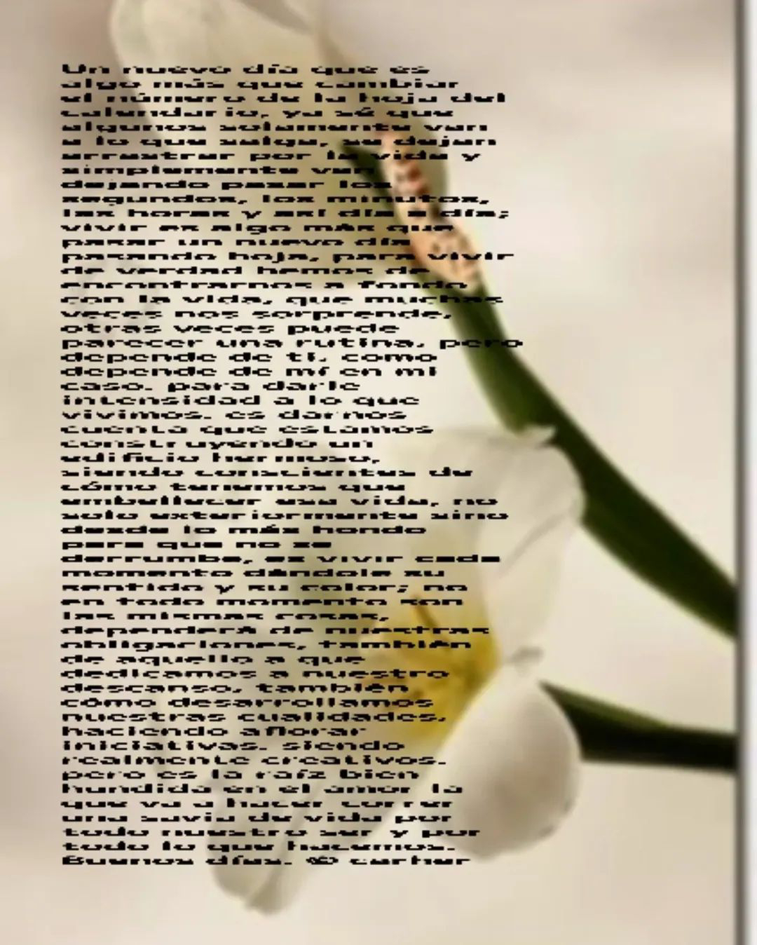 Buenos días, al comenzar el camino de un nuevo día podemos tener muchos sueños, hermosos deseos, planes maravillosos pero realmente no sabemos si va a ser un día de cosas extraordinarias o un día aparentemente rutinario donde nada parece destacar; pero no importa que esté hecho de esas cosas que en la normalidad de nuestra existencia suceden cada día y parece que no tienen importancia, pero aún así saborea la vida, disfruta de esas cosas pequeñas que se repiten cada día y se convertirán en cosas maravillosas en las que puedes encontrar un nuevo sabor; depende de ti, de tu actitud, de la positividad con que te enfrentas a la vida, del color que le quieras dar, del calor de vida que sea capaz de suscitar, de lo que te ames a ti mismo y de lo que seas capaz de sorprenderte en lo que sucede ordinario a tu alrededor, de los ojos con que mires la vida y cuanto te sucede, de la sintonía que seas capaz de encontrar en los sonidos de vida que te ofrecen los que caminan a tu lado; no harás cosas extraordinarias pero al final te darás cuenta que estás haciendo un día maravilloso. Buenos días. © carher